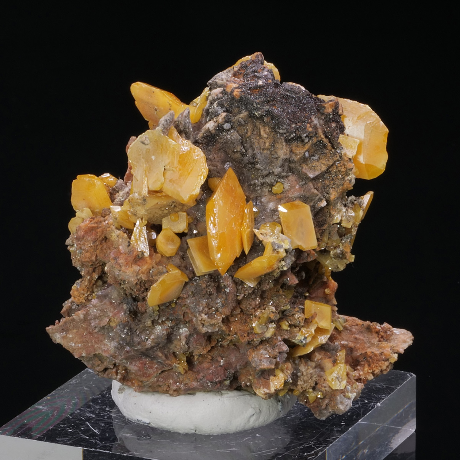 Nombreux cristaux de Wulfénite présentant une superbe couleur de feu, orange intense et brillant. Belle qualité pour ce spécimen provenant de Touissit au Maroc.