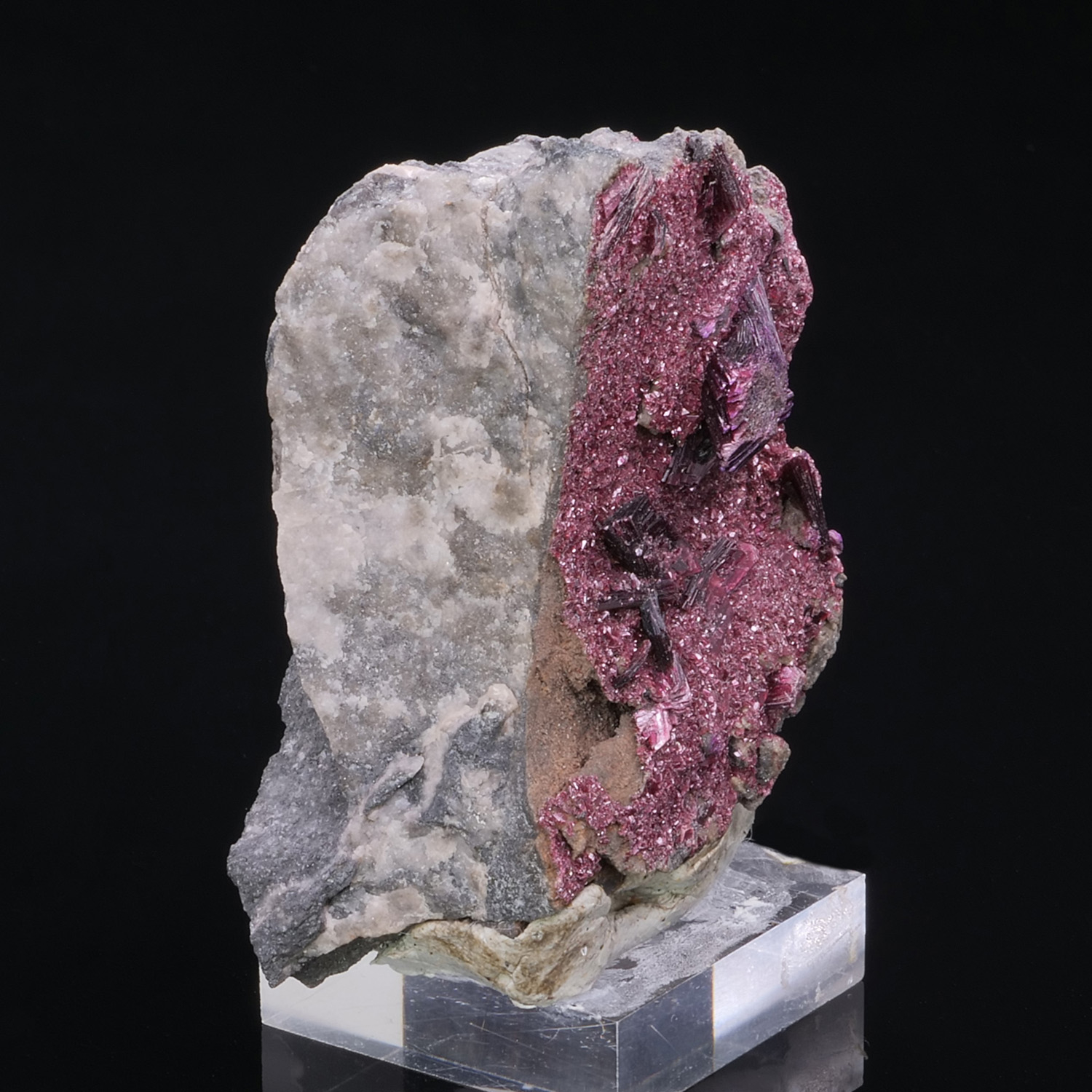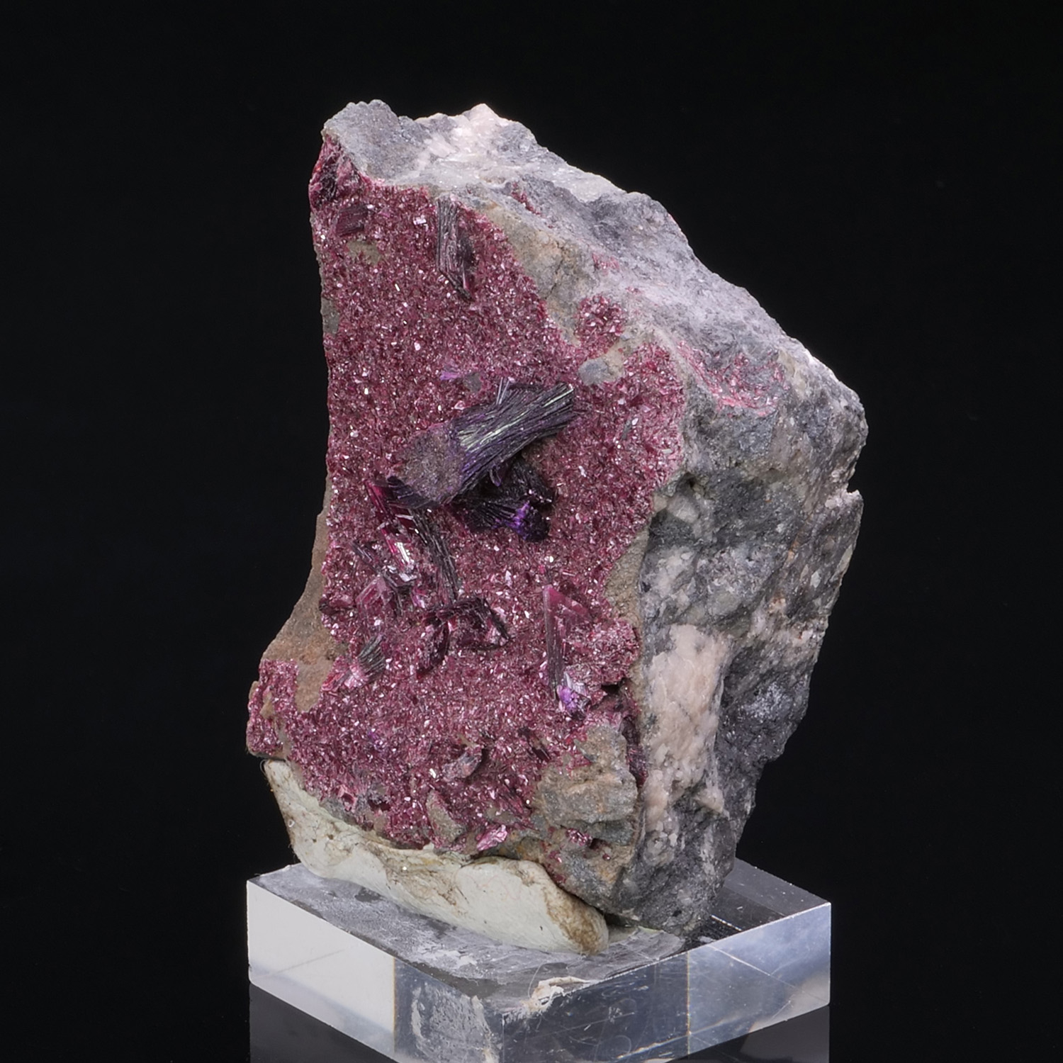Nombreux cristaux d’Erythrite dont de très grands, sur gangue et provenant de Bou Azzer au Maroc. Les plus grands cristaux présentent une couleur fuchsia presque violet. Les plus fins et petits sont rose très foncé.