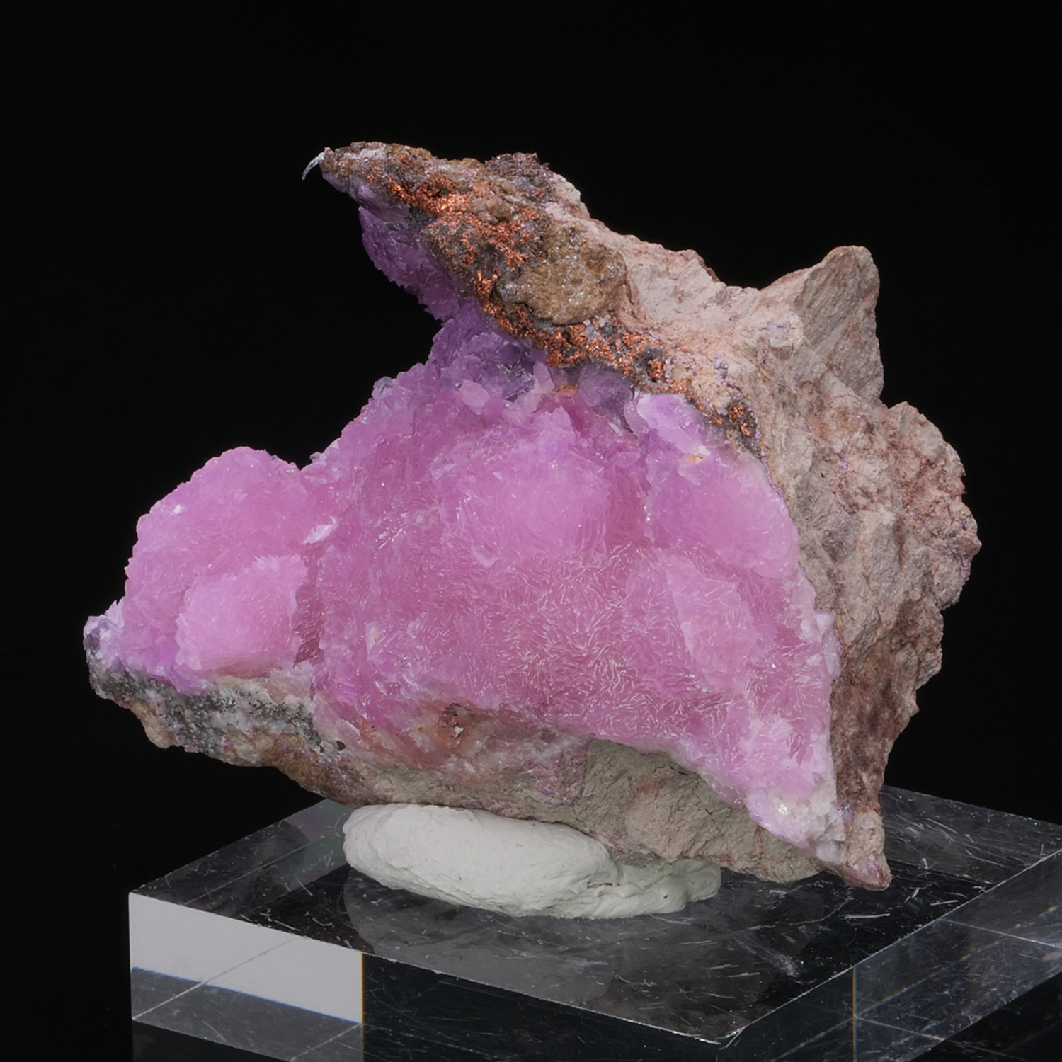 Cobaltocalcite en beaux cristaux rose intense associé à du Cuivre natif sur le haut de la pièce qui est rare à trouver. Belle association provenant de la célèbre mine Mashamba West en RD Congo.