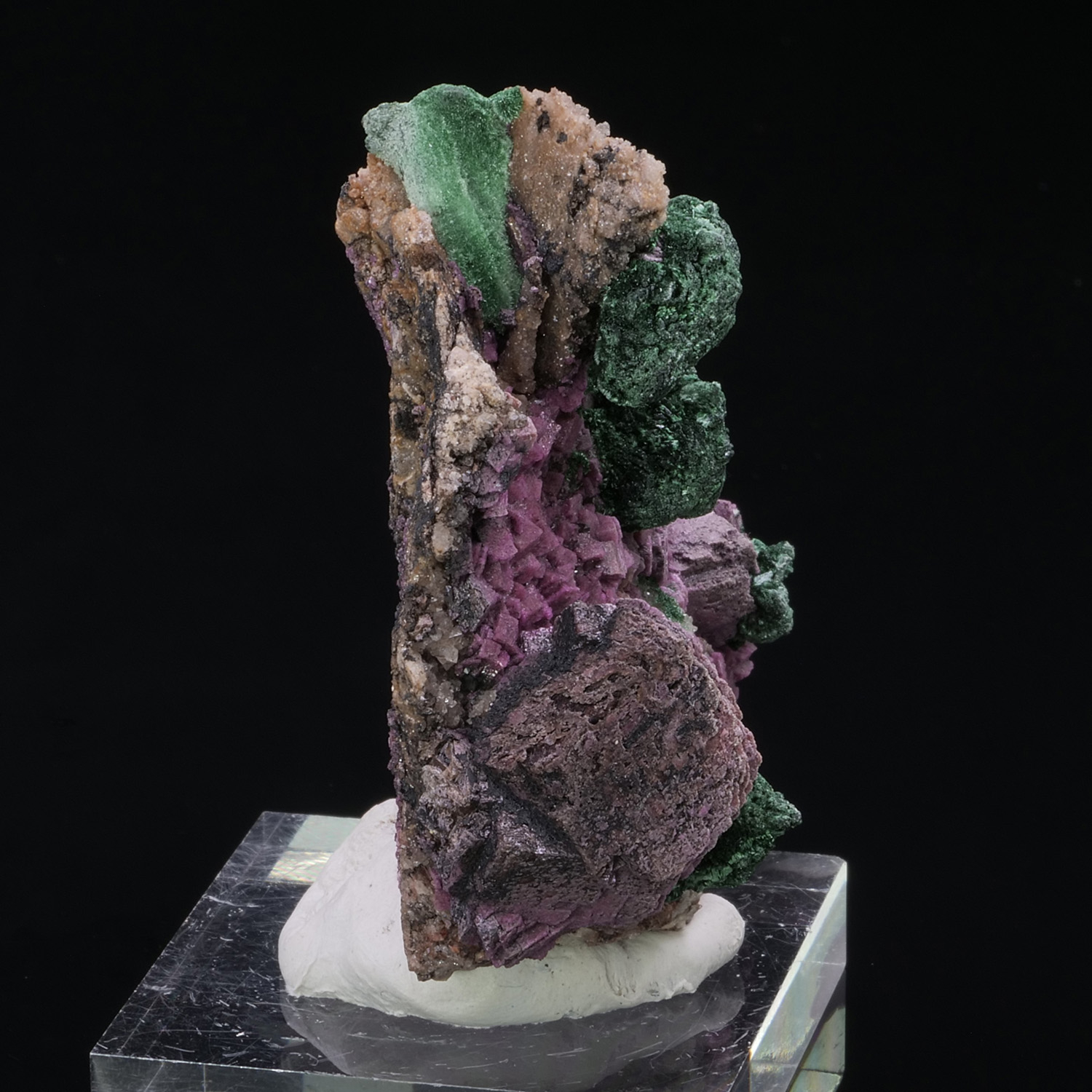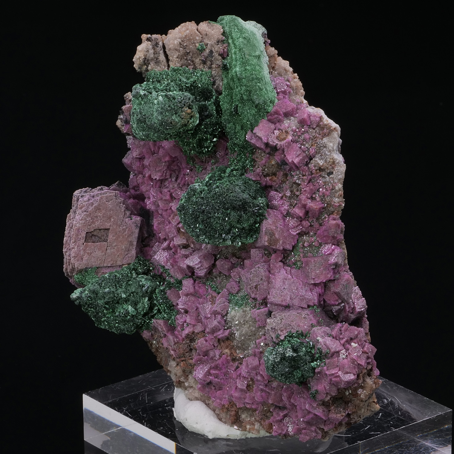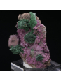 Cristaux de Cobaltocalcite rose foncé et parfaitement formés associés à de la Malachite fibreuse qui offre une belle palette de couleurs. Spécimen provenant de la mine Mashamba West en RD Congo.