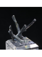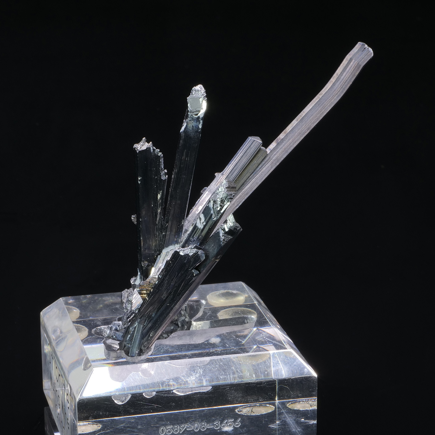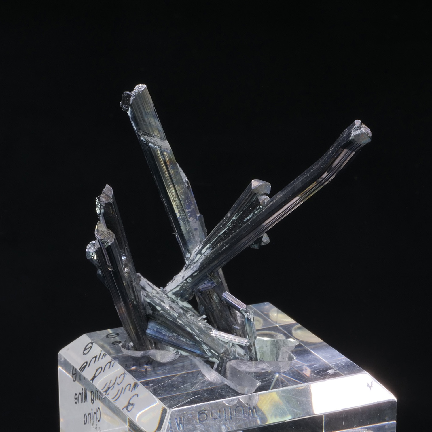 Stibine provenant de la mine Wuning avec de nombreux cristaux à l’éclat métallique. Spécimen vendu avec son socle gravé sur mesure pour une tenue sans pâte ni colle.