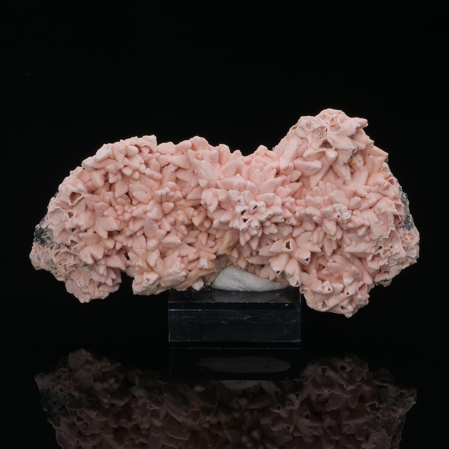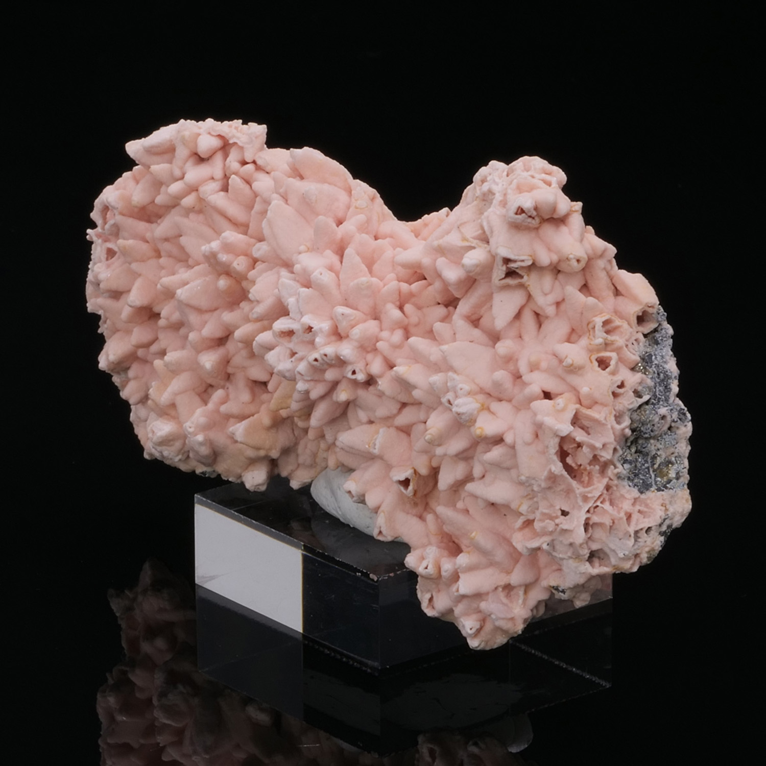 Spécimen incroyable de Rhodochrosite qui est pseudomorphosé après Calcite, c’est-à-dire qui a remplacé la Calcite, sur Quartz provenant de la mine Oppu au Japon. Ce spécimen est incroyable tant par sa couleur rose que par sa formation. Les cristaux de Calcite en dents de chien qui ont été remplacé sont complètement visibles et offrent un visuel impressionnant. Pièce de collection rare d’une provenant mondialement connue.