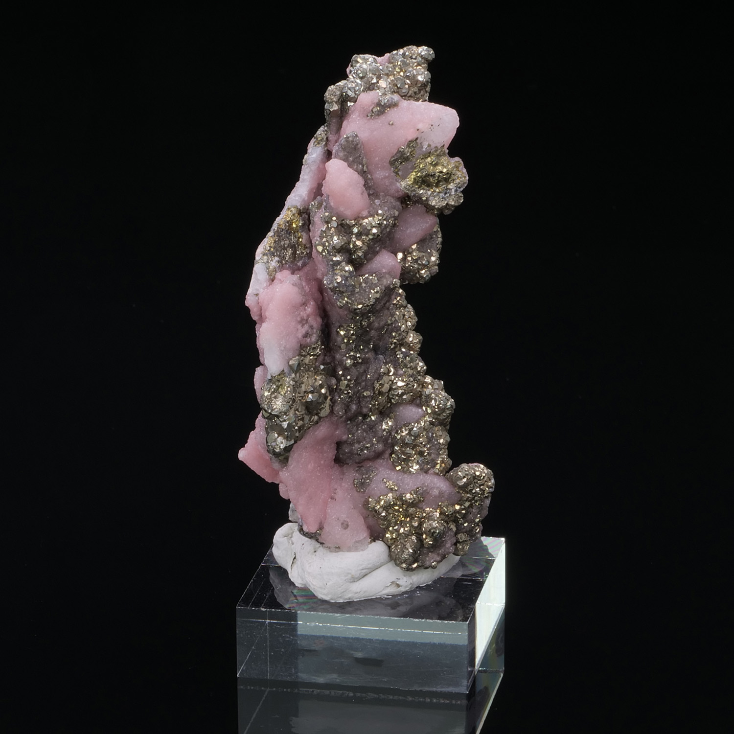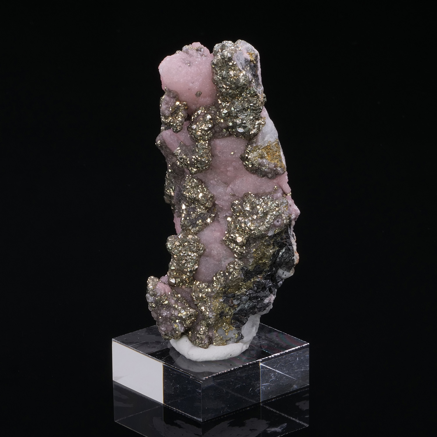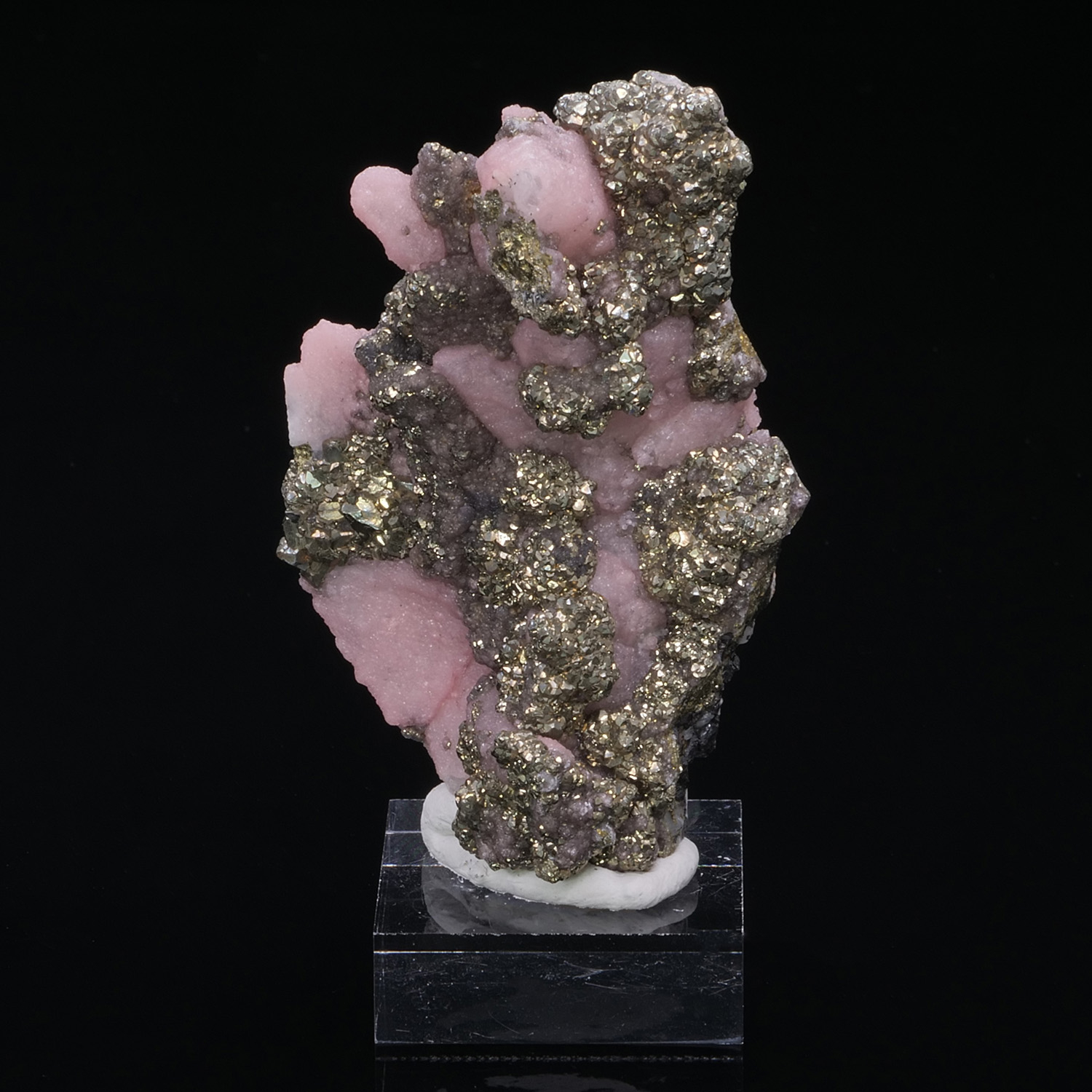 Superbe spécimen de Rhodochrosite pseudomorphosé après Calcite, c’est-à-dire que la Rhodochrosite a remplacà la Calcite, associé à de la Pyrite. Cette pièce provient de la mine Oppu au Japon, localité mondialement connu pour avoir de superbes et rares spécimens de Rhodochrosite. Celui-ci est très impressionnant de par sa cristallisation et la couleur est vraiment sublime. Belle brillance pour cette pièce japonaise.