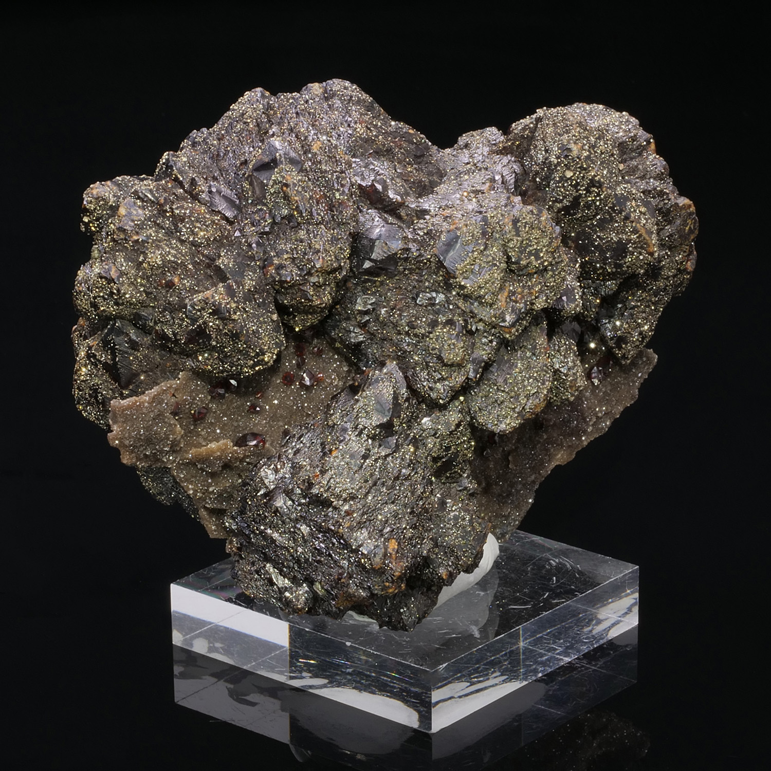 Remarquable spécimen avec deux générations de Sphalérite qui sont formées sur les deux côtés d’une matrice de Silex. Cette formation est typique de Tri-State aux Etats-Unis. Les plus gros cristaux, très foncés, sont la première génération, les cristaux très rouge gemmes, Ruby jack, sont la seconde. Les deux générations sont présentes de part et d’autre de la fine couche de silex, ceci est bien visible sur la vidéo. Ex collection Koch (Belgique).