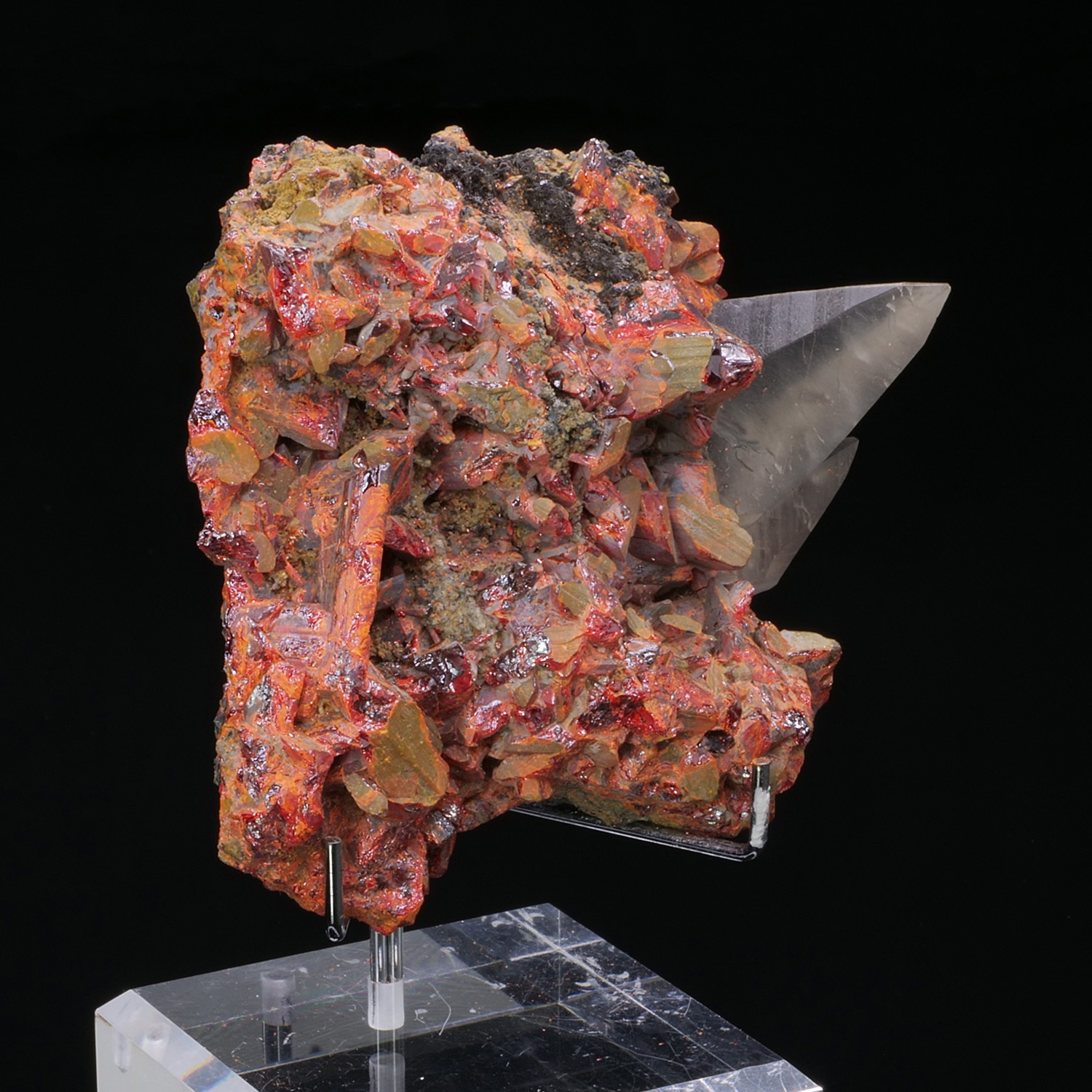 Cristaux de Realgar très fragiles, associés à des cristaux de Calcite gris bien formés, provenant de la mine Jiepaiyu en Chine.