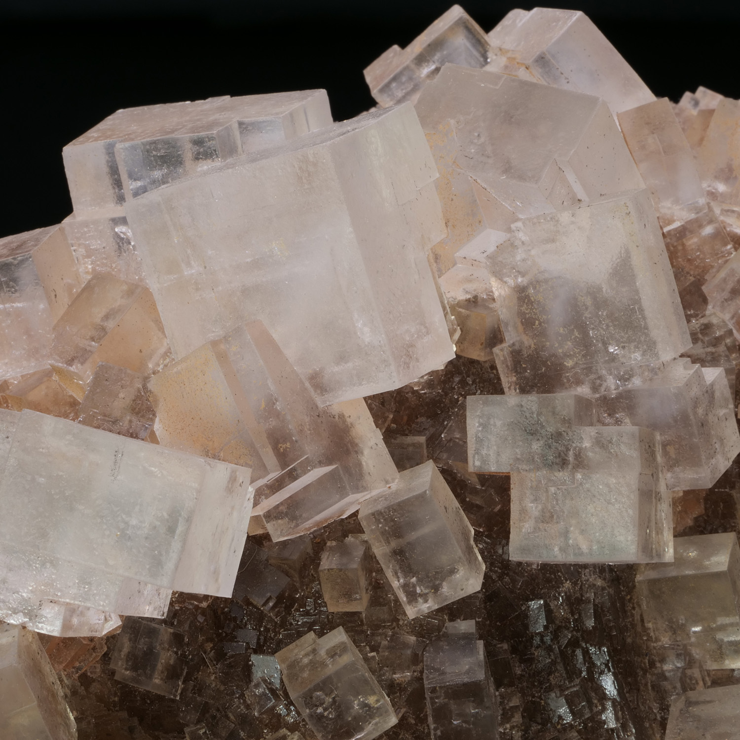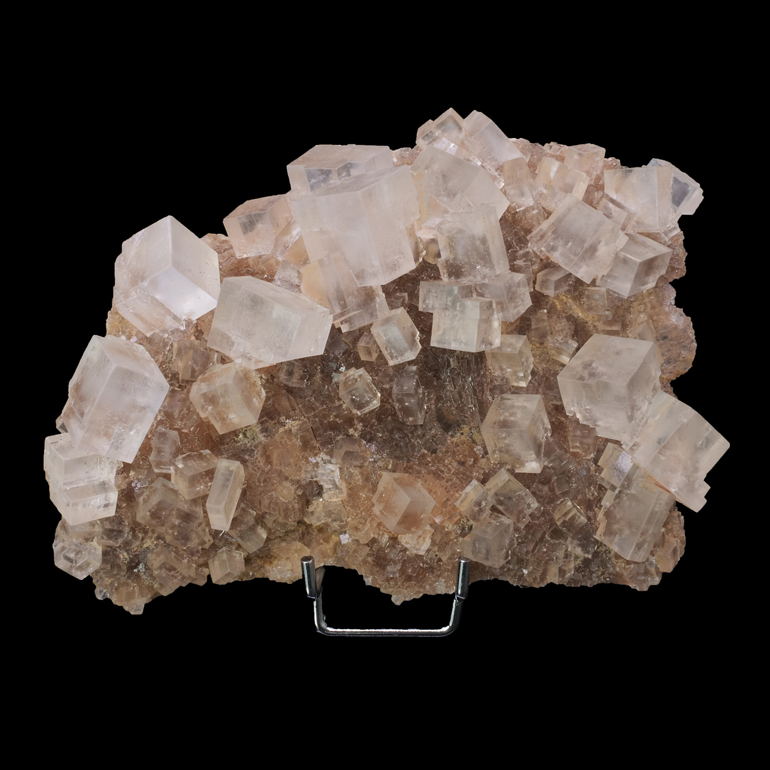 Superbes cristaux de Halite, ou sel gemme, avec des cristaux bien formés eux arêtes tranchantes et complètement translucide, sur gangue de Halite massive. Ce spécimen provient de Jdiriya au Maroc. Très belle qualité pour cette Halite aux cristaux gemmes.