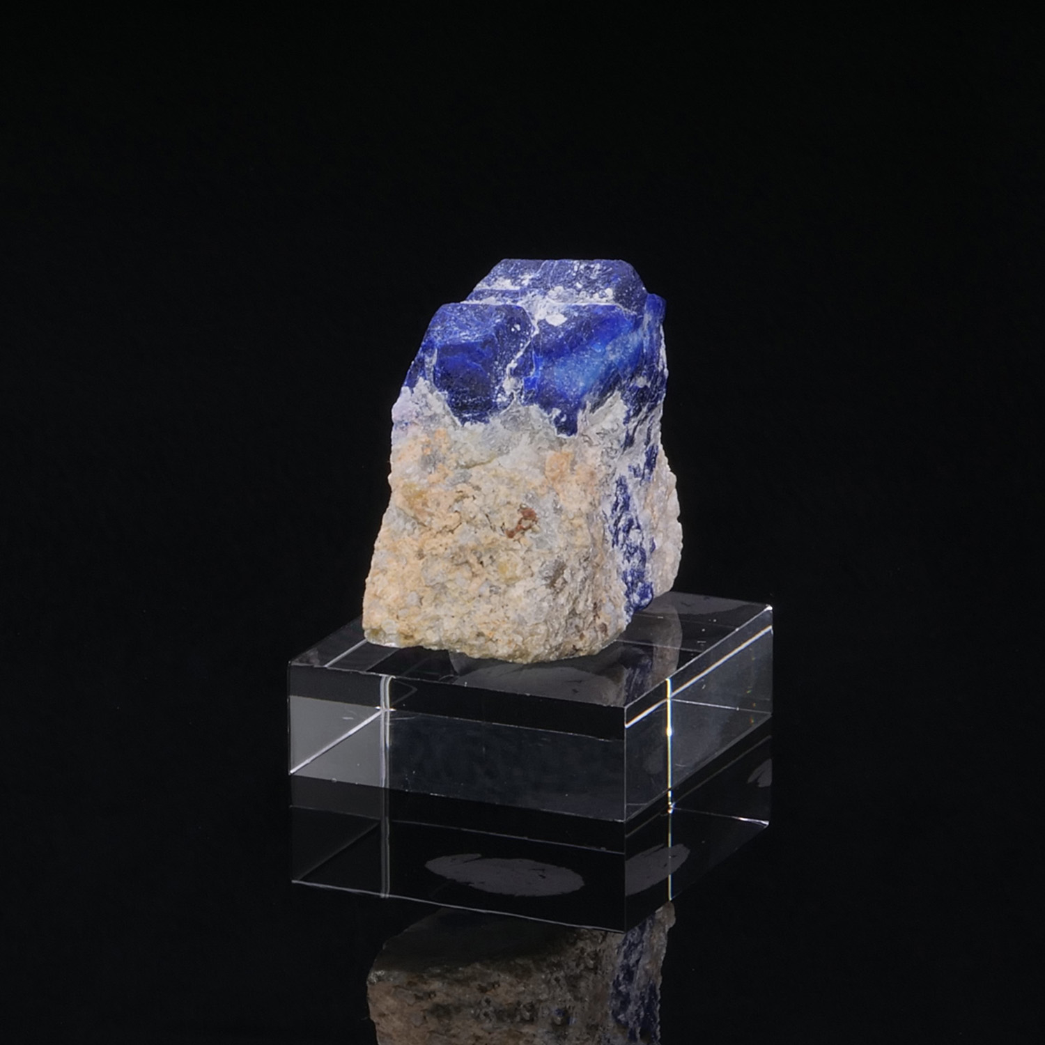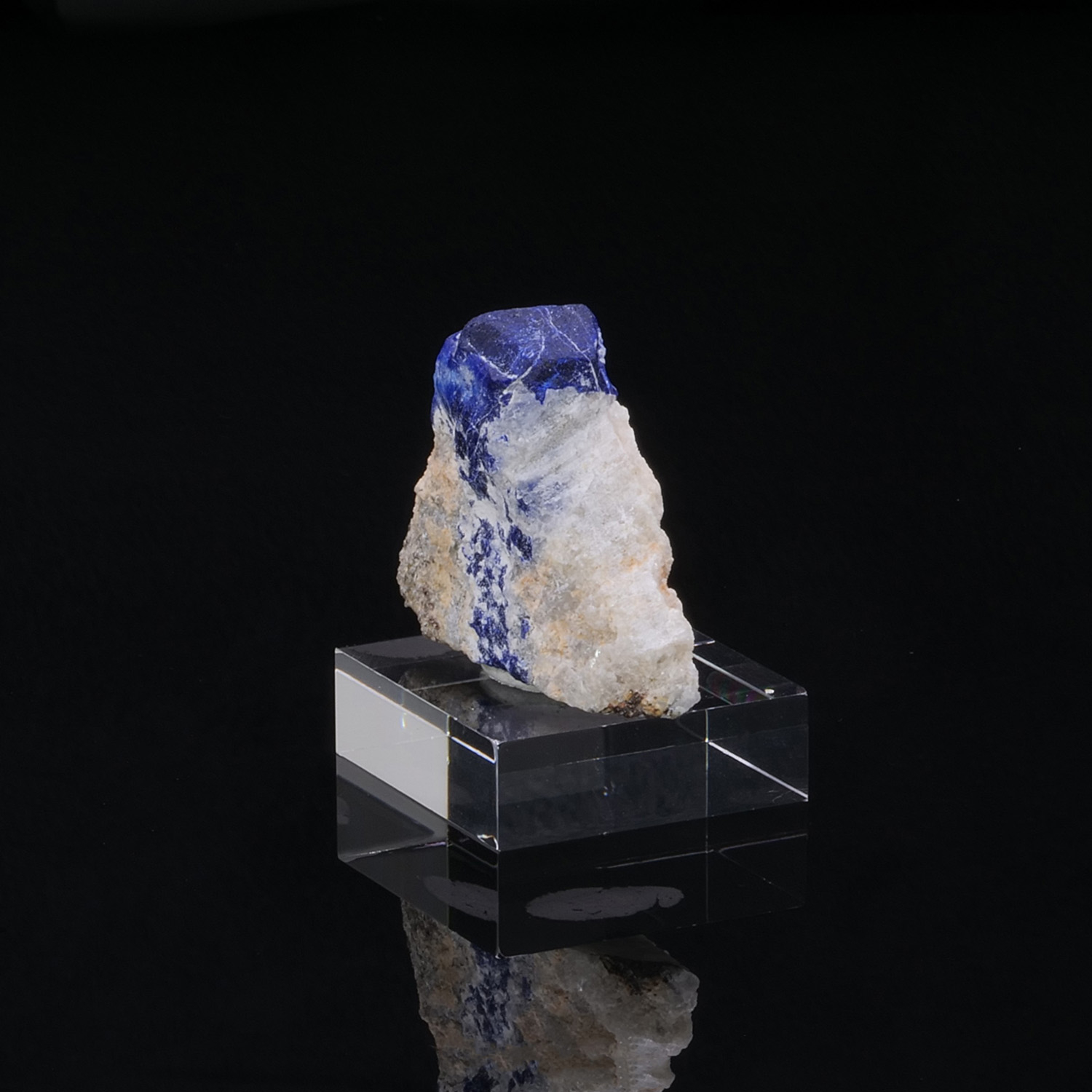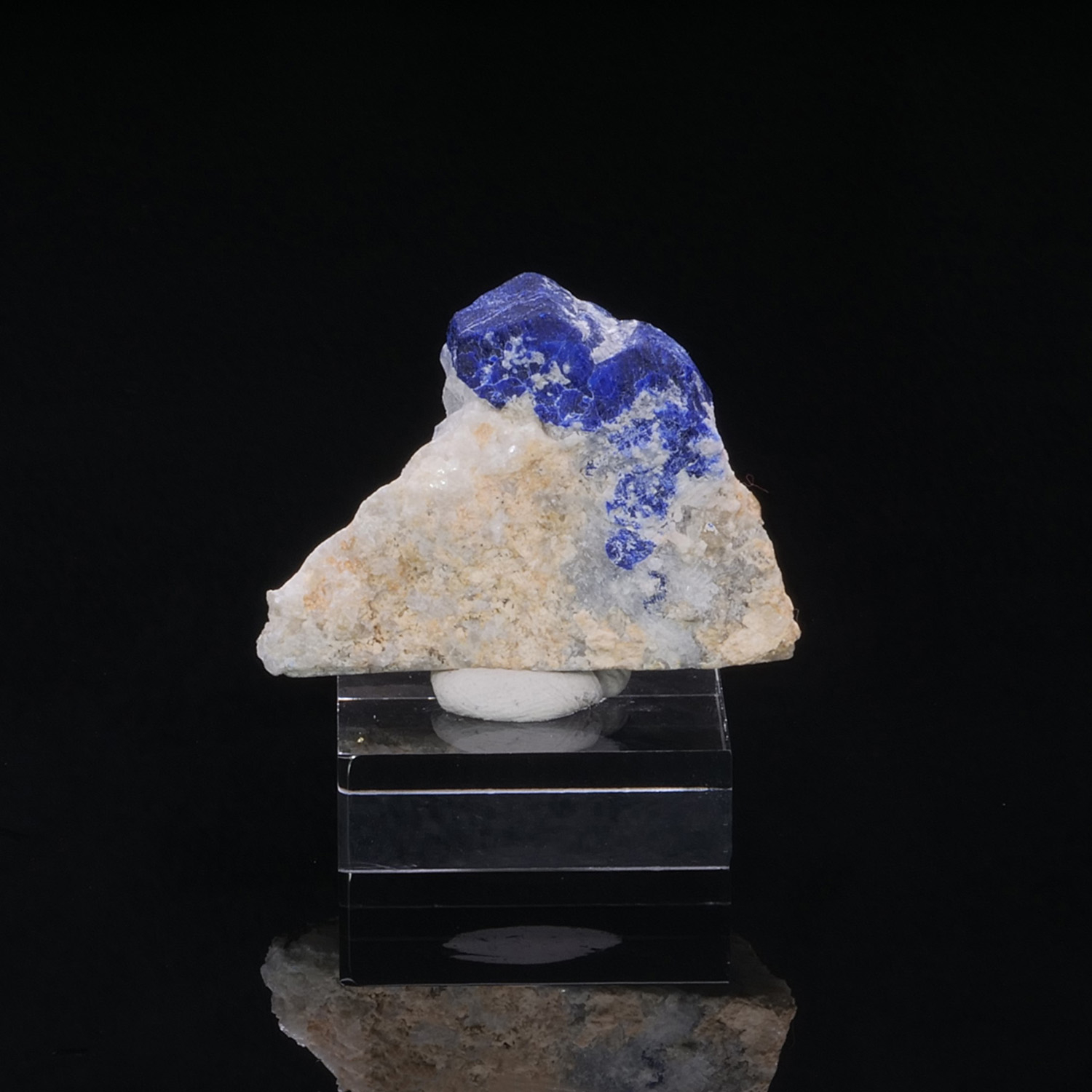 Cristal de Lazurite bleu roi intense perché sur sa gangue de Calcite blanche immaculée qui offre un beau contraste de couleur. Spécimen provenant de Sar e Sang en Afghanistan.