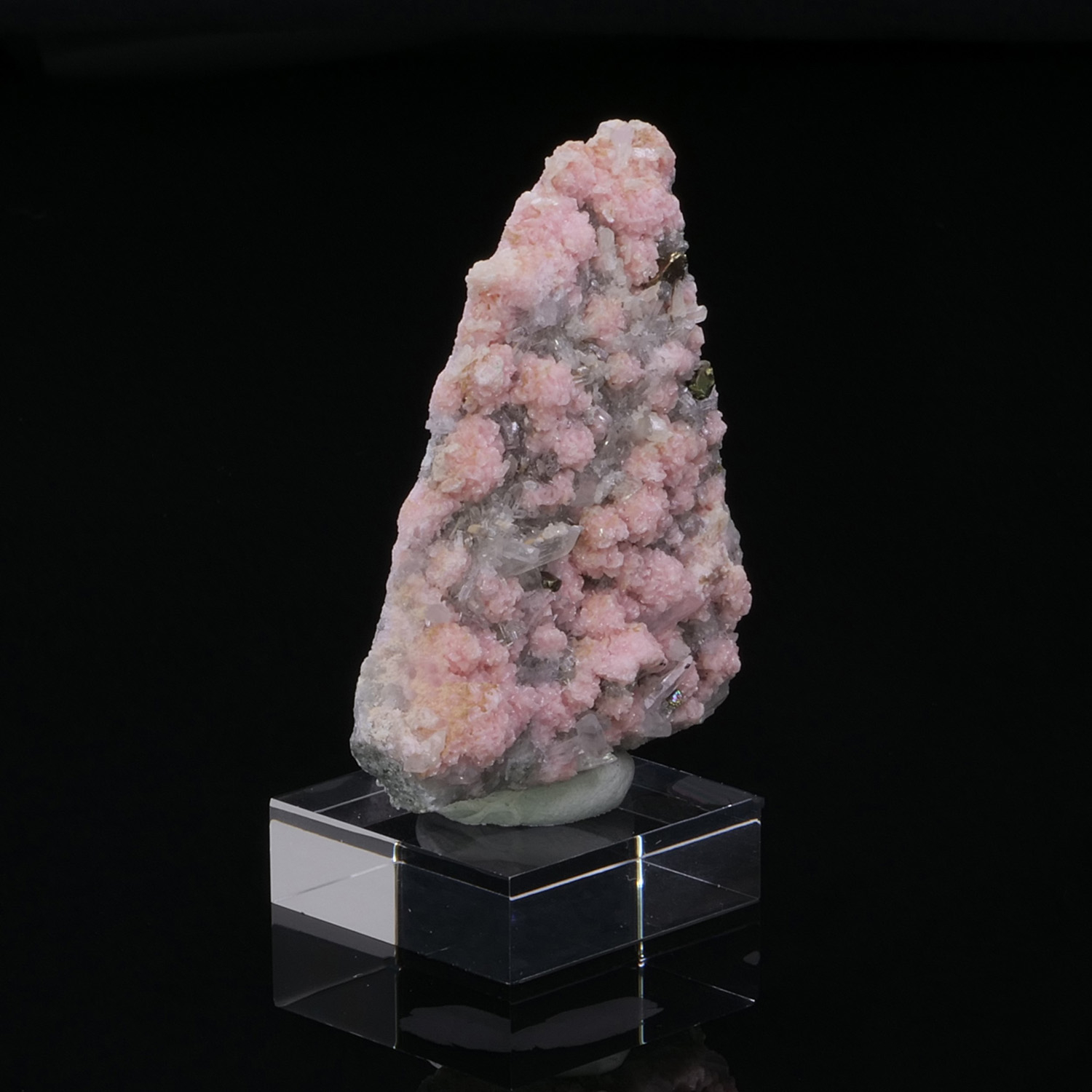 Rosettes de Rhodochrosite associées à de la Sphélarite et des Quartz qui rendent l’ensemble bien brillants. Belle couleur bien prononcée pour la Rhodochrosite rose. Spécimen provenant de Madan en Bulgarie.