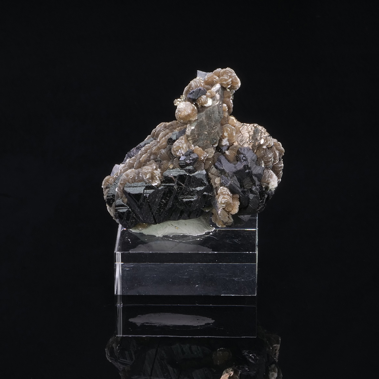 Cristaux de Ferbérite et Arsénopyrite associés à des pétales de Sidérite provenant de Panasqueira au Portugal.