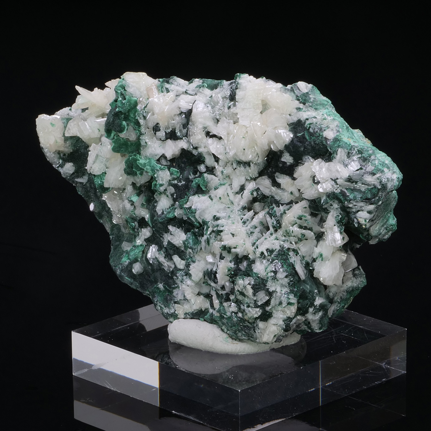 Spécimen de Cérusite sur Malachite de la mine Nakhlak en Iran. Ces pièces présentent des cristaux de Cérusite blanches comme des flocons de neige sur Malachite brotryoïdale verte foncée ressemblant à du velours. Celle-ci est particulièrement jolie avec la Cérusite qui forme comme une plume sur la Malachite.