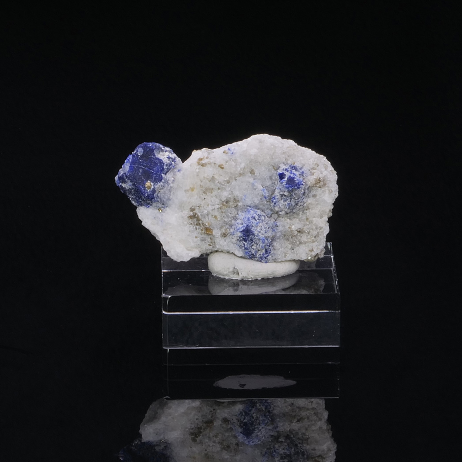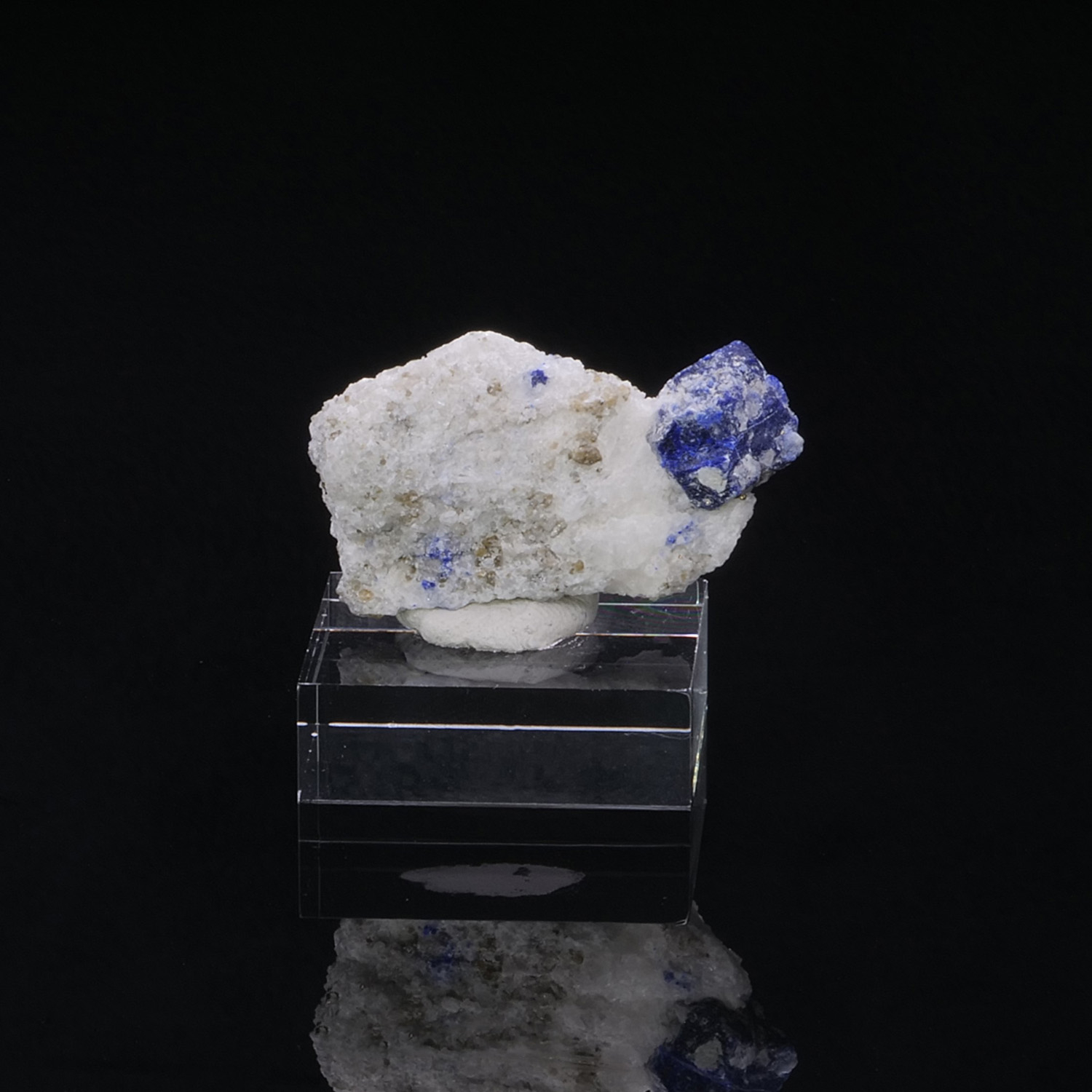 Cristal de Lazurite bleu roi intense perché sur sa gangue de Calcite blanche immaculée qui offre un beau contraste de couleur. Spécimen provenant de Sar e Sang en Afghanistan.
