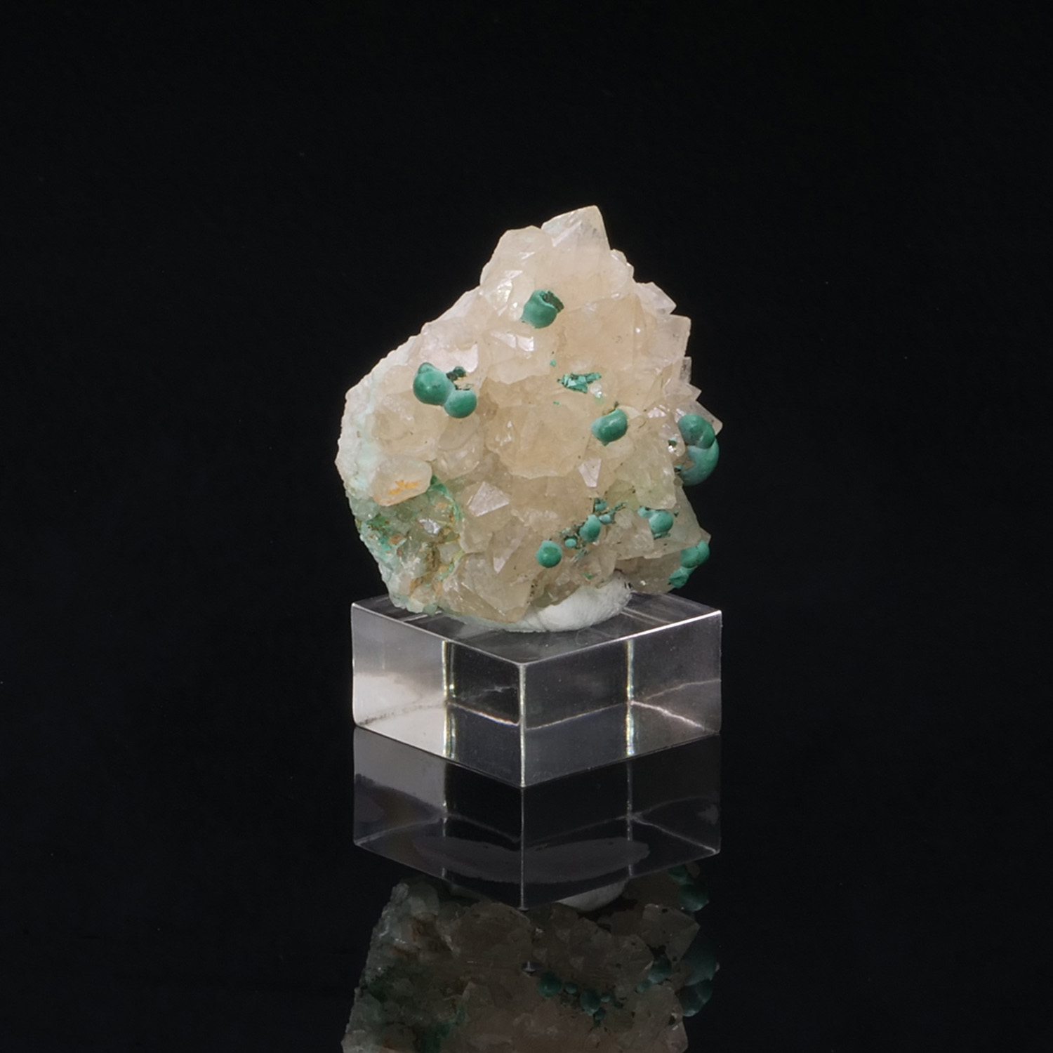 Cristaux boules de Malachite à la couleur verte bien prononcée, sur fleur de Quartz bien formée provenant de Bouque Payrol en France.