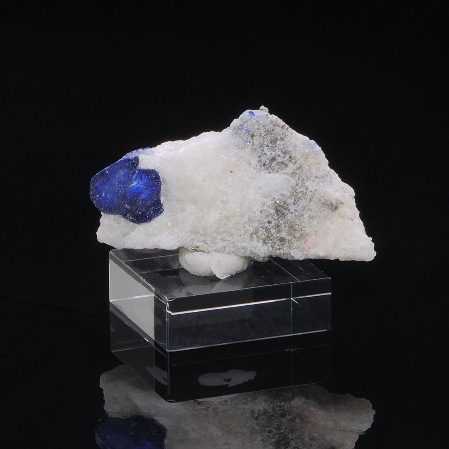Cristal de Lazurite bleu roi intense perché sur sa gangue de Calcite blanche immaculée qui offre un beau contraste de couleur. Spécimen provenant de Sar e Sang en Afghanistan.