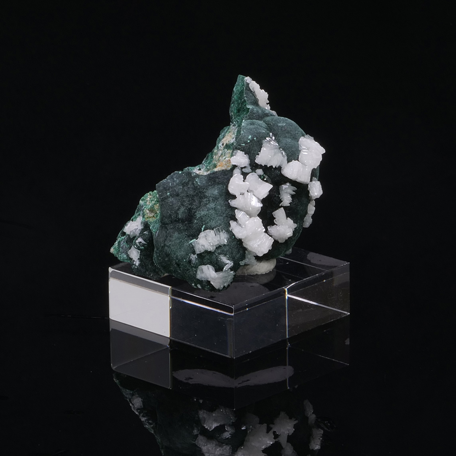 Spécimen de Cérusite sur Malachite de la mine Nakhlak en Iran. Ces pièces présentent des cristaux de Cérusite blanches comme des flocons de neige sur Malachite brotryoïdale verte foncée ressemblant à du velours.