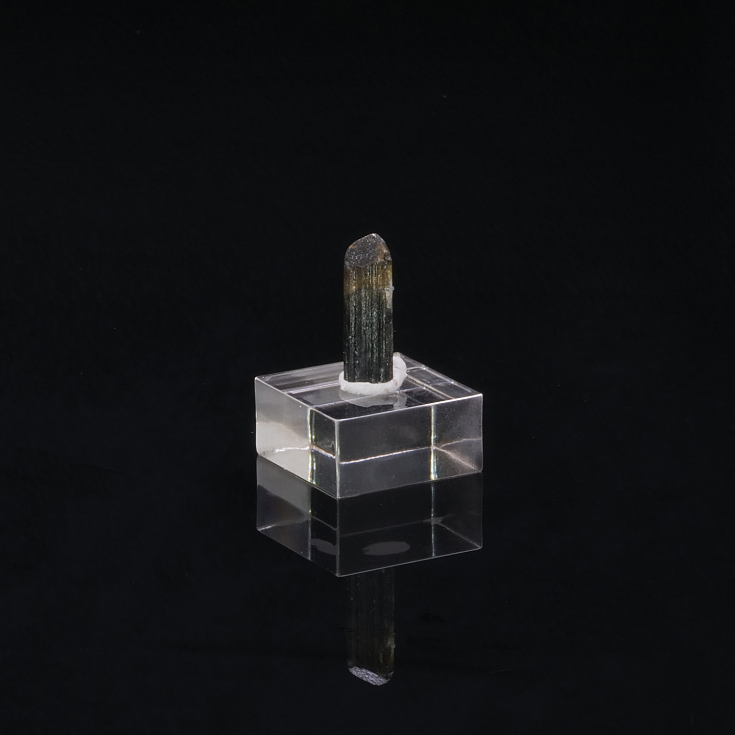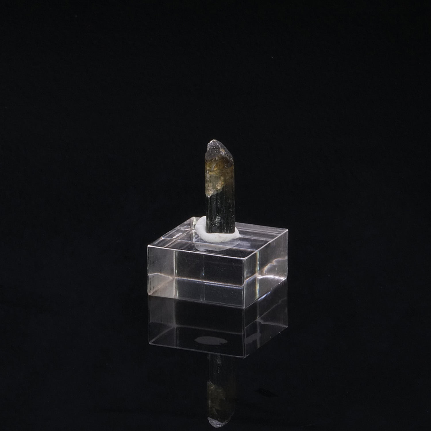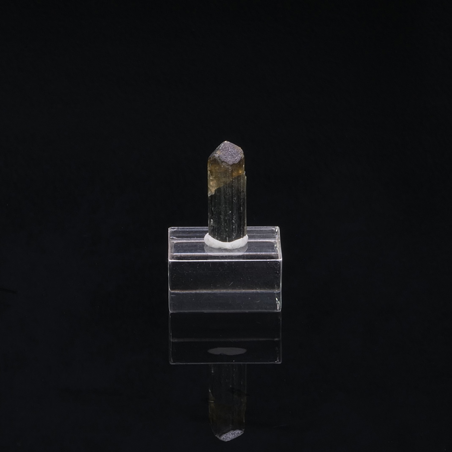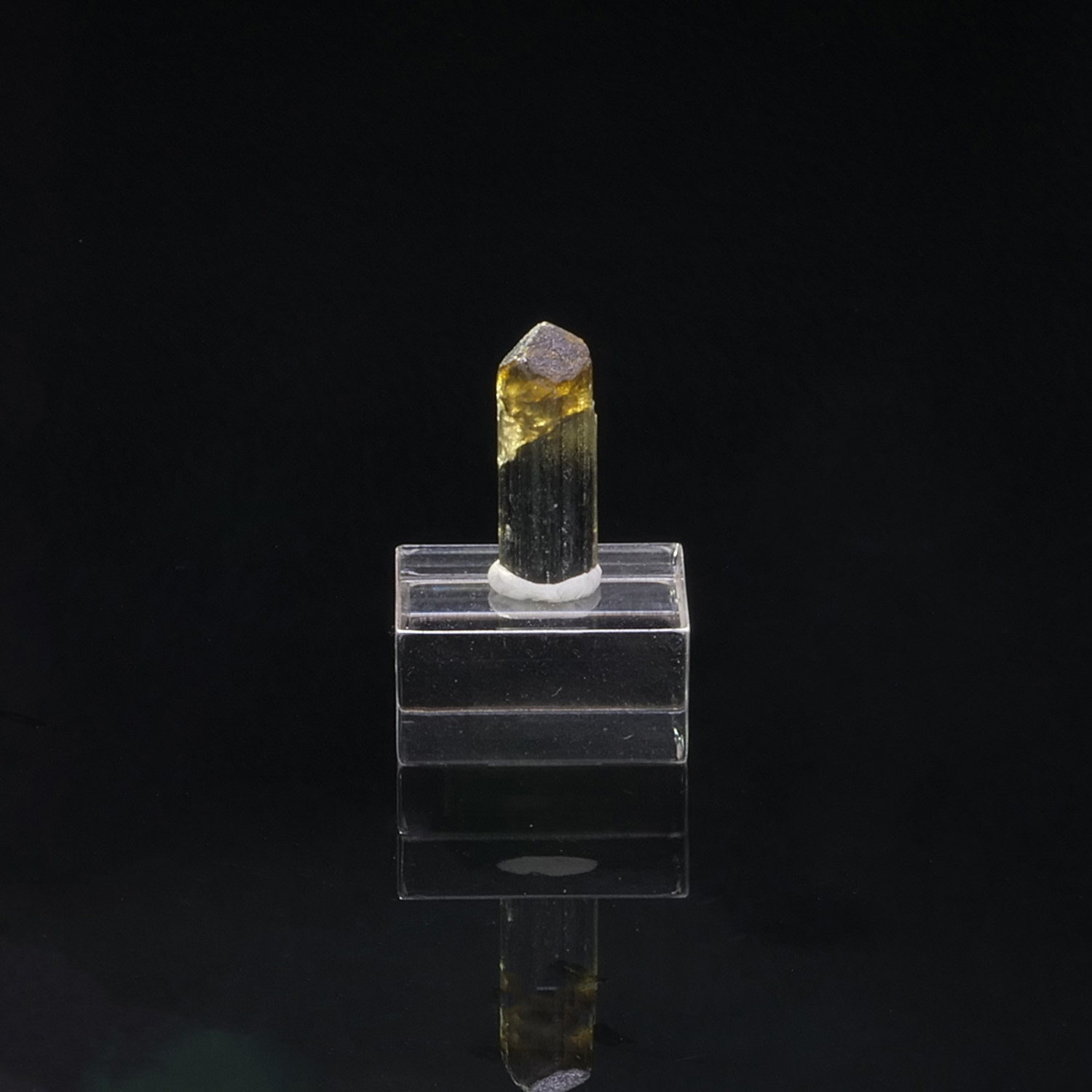 Très beau cristal de Tourmaline centimétrique bicolore : jaune à la pointe puis vert très foncé. Les couleurs de ce spécimen sont encore plus mises en avant lorsque nous l’éclairons en rétroéclairage ! Tourmaline provenant de Tsarafara Sud à Madagascar.