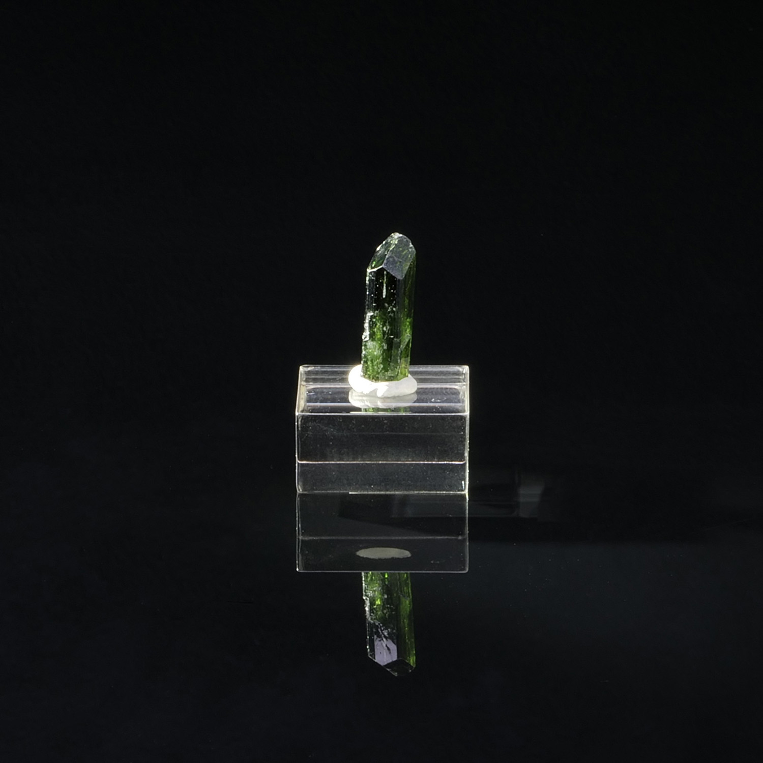 Cristal terminé et gemme de Chrome Diopside, minéral rare cristallisé ainsi, du Pakistan. Le cristal est vert intense, lustré et présente une très belle limpidité.